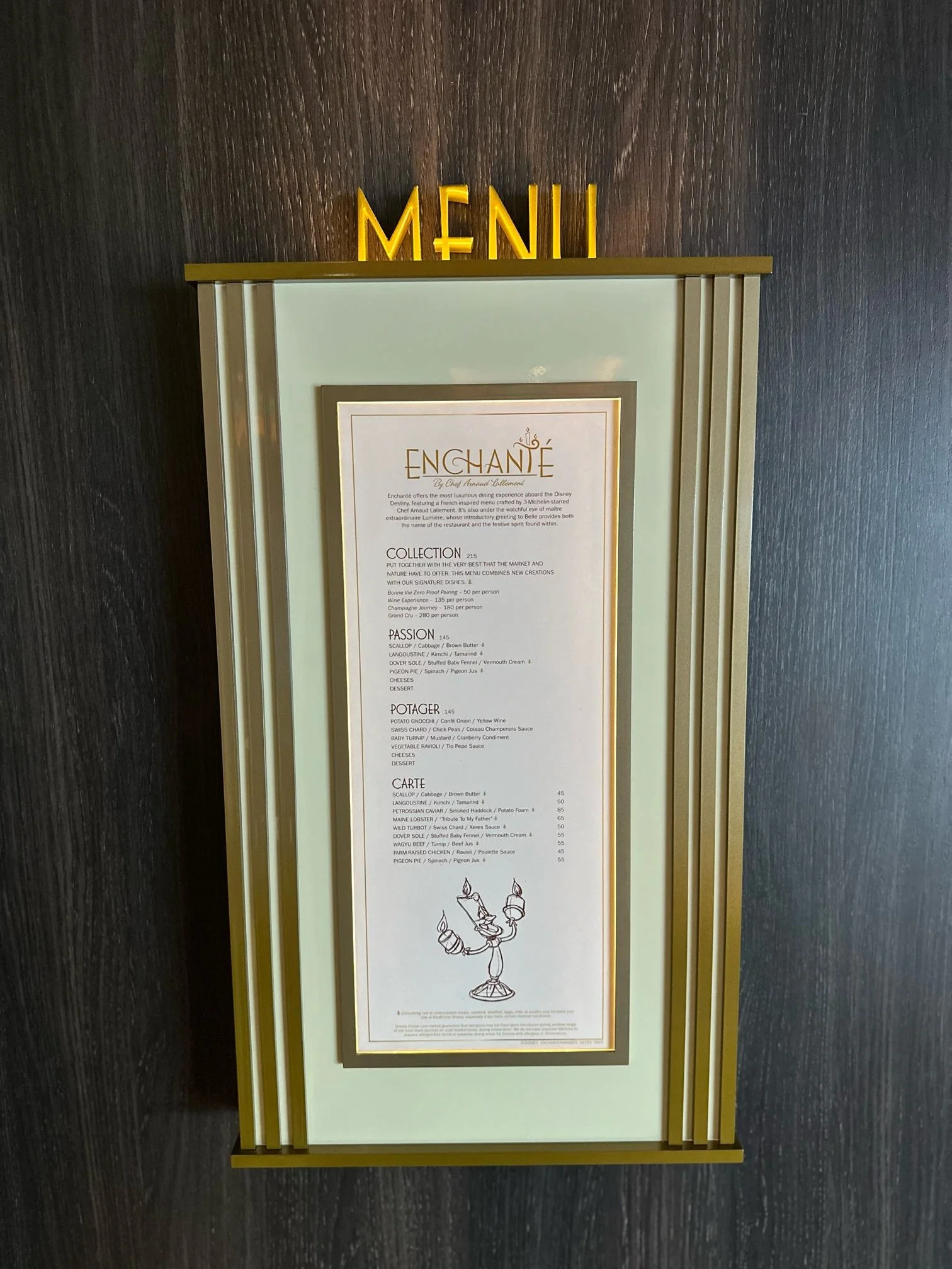 Inspired by Beauty and the Beast, Enchanté is an adult-exclusive fine-dining restaurant offering French-inspired cuisine. The menu is crafted by Chef Arnaud Lallement, a three-Michelin-star chef from L’Assiette Champenoise in France, who also collaborates on Remy aboard other Disney ships.